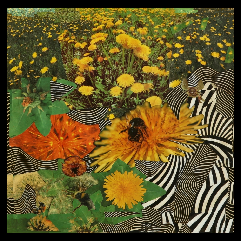 DANDELIONS BEES & WIND is a collage made with salvaged papers by Dave Lineal in Chicago. The original piece measures 16″ x 16″ & is available for purchase by contacting the artist.