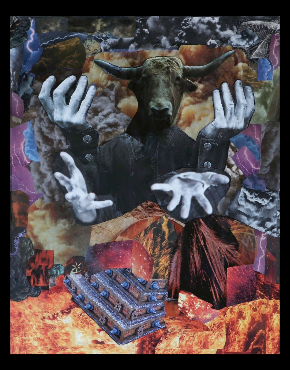 MOLOCH 2025 is a collage made with salvaged papers by Dave Lineal in Chicago. The original piece measures 18″ x 24″ and is available for purchase by contacting the artist.